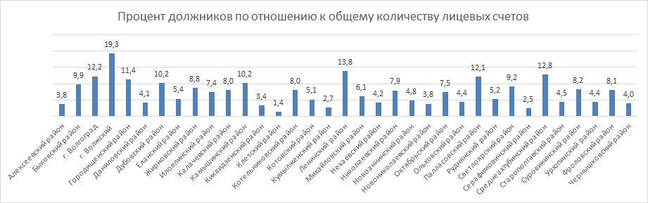 Для более точной и объективной картины в диаграмме ниже число должников в процентном отношении соотнесено с общим количеством лицевых счетов в том или ином районе. Таким образом, в процентном отношении больше всего должников оказалось в городе Волжском, Волгограде, а также Ленинском, Среднеахтубинском, Палласовском и Городищенском районах.