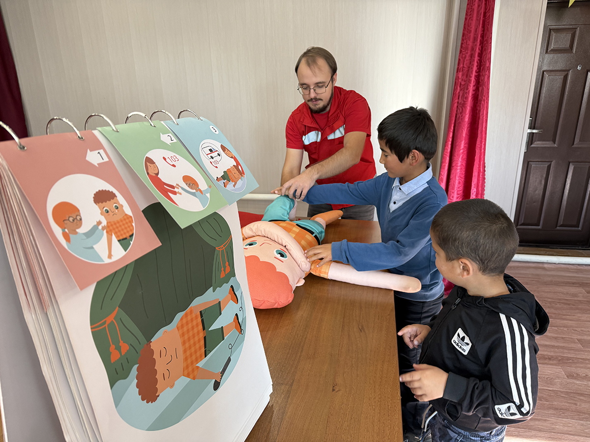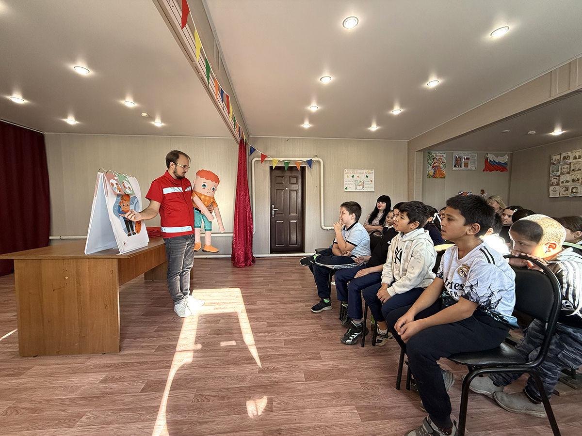 Волонтеры регионального отделения «Российского Красного Креста» провели мастер-класс по основам первой помощи в простых ситуациях для учащихся начальной школы хутора Челюскинец.